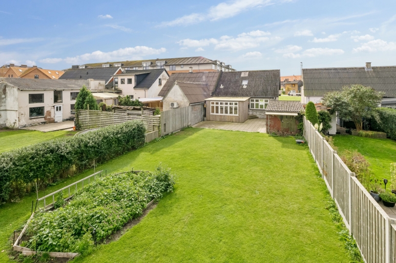 Grunden består af fælles opkørsel til garagen, og herfra er der indgang til haven, der er anlagt med en større terrasse, der delvis er overdækket og en stor græsplæne indhegnet med hæk / stakit. Nederst i haven er et fint fritliggende udhus med strøm, som har været brugt til hobbyrum.