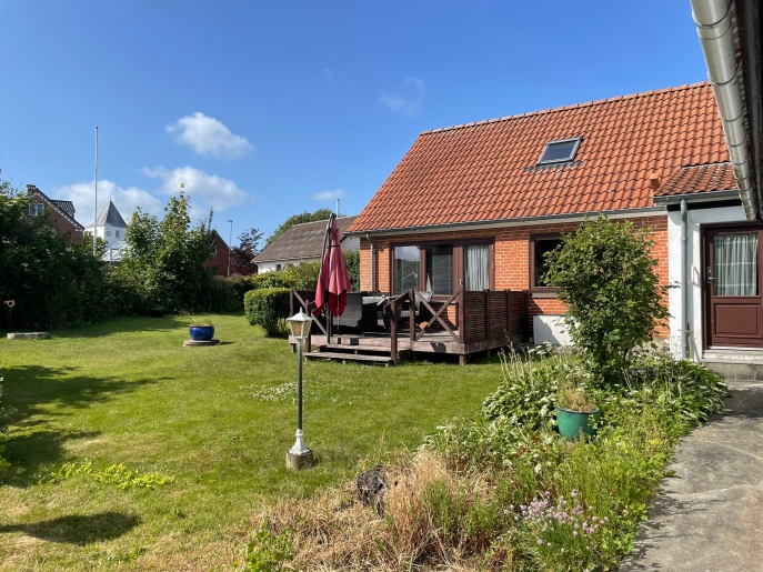 Grunden består af 2 matrikler, som er sammenlagt. Grunden er udlagt med en syd / vestvendt have, der mest består af græsplæne / hæk og en terrasse. Yderligere er der et ældre udhus, der har flere rum og kan benyttes til mange formål. Fra sidevejen er der indkørsel til en god muret garage.
